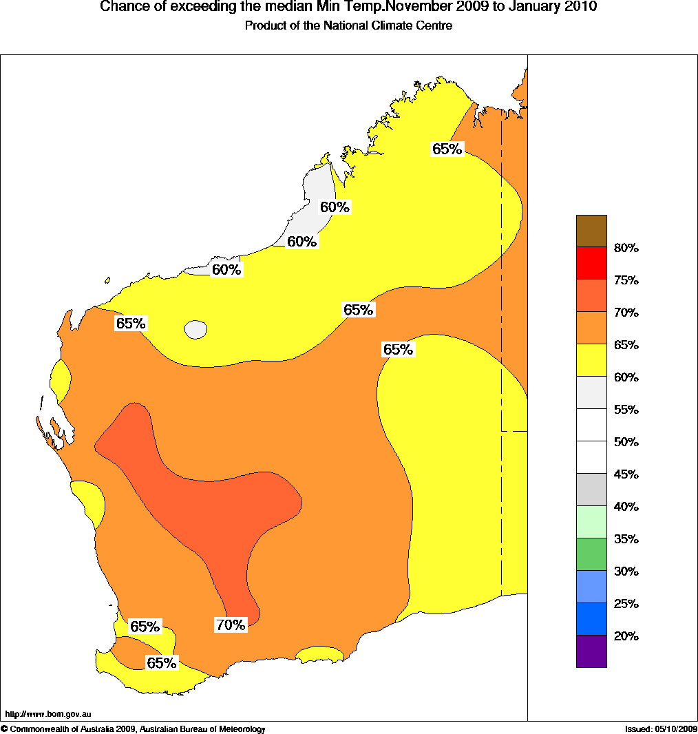 Warmer nights likely for WAThe WA outlook for temperatures over the November to January period shows a moderate to strong tendency for warmer than normal minimum temperatures across WA, especially in the south and west. Contrasting this, cooler daytime temperatures are more likely over the Interior.