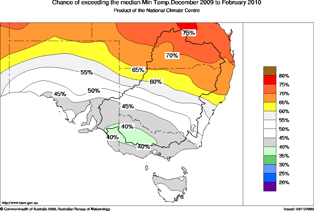 For southeastern Australia, the outlook for mean summer (December-February) temperatures favours warmer conditions in far northern NSW, while cooler than normal nights are indicated in parts of Victoria and SA.