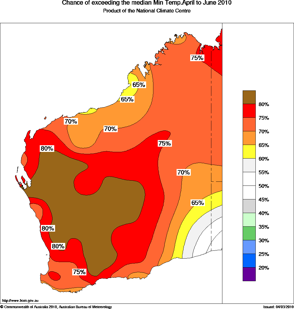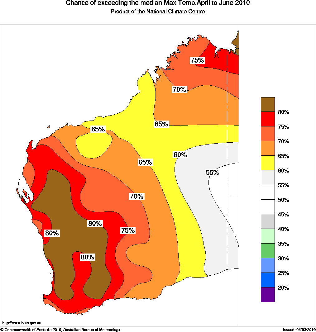 WA Seasonal Temperature Outlook: probabilities for April to June 2010, issued 23rd March 2010