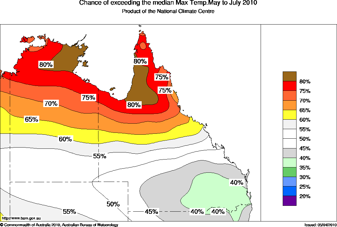 Northern Aust Seasonal Temperature Outlook: probabilities for May to July 2010, issued 22nd April 2010