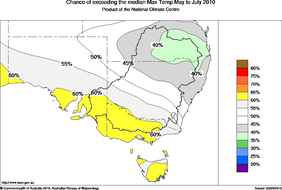 Southeastern Aust Seasonal Temperature Outlook: probabilities for May to July 2010, issued 22nd April 2010