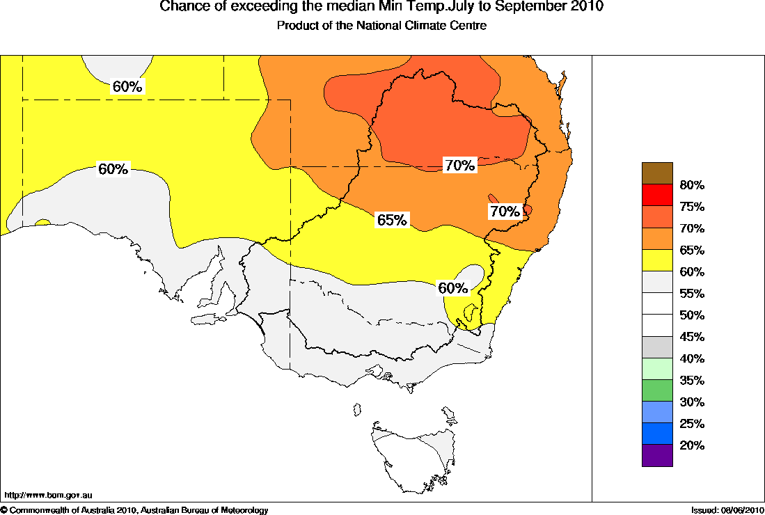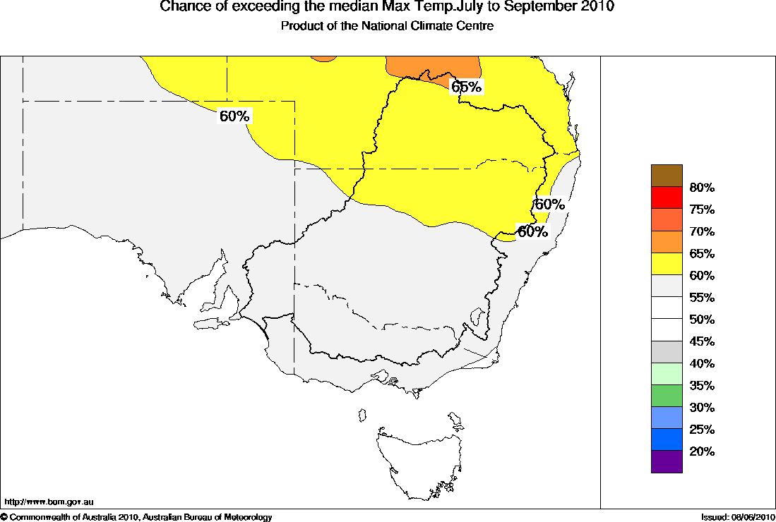 The outlook for average maximum temperatures over the September quarter (July to September) favours warmer than normal daytime temperatures over northern NSW and far northeast SA. Warmer than normal minimum temperatures also favoured over northern SA and much of NSW.