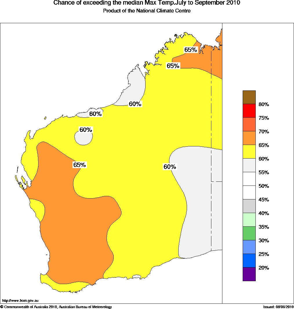 The chance that the average maximum temperature for the July to September period will exceed the long-term median maximum temperature, ranges from 60 to 70% across most of WA. This means that for every ten years with ocean patterns like the current, about six or seven years would be expected to be warmer than average during the September quarter over most of WA, with about three or four years being cooler.
