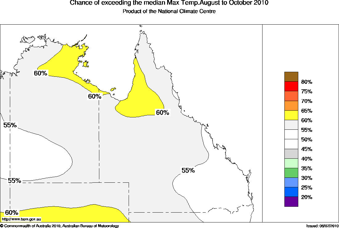 The chance that the average August-October maximum temperature will exceed the long-term median maximum temperature,is mostly between 50% and 60%, and exceeds 60% in the Gulf of Carpentaria region. This means that for every ten years with ocean patterns like the current, about six years would be expected to be warmer than average during the August to October period near the Gulf of Carpentaria, with about four years being cooler.