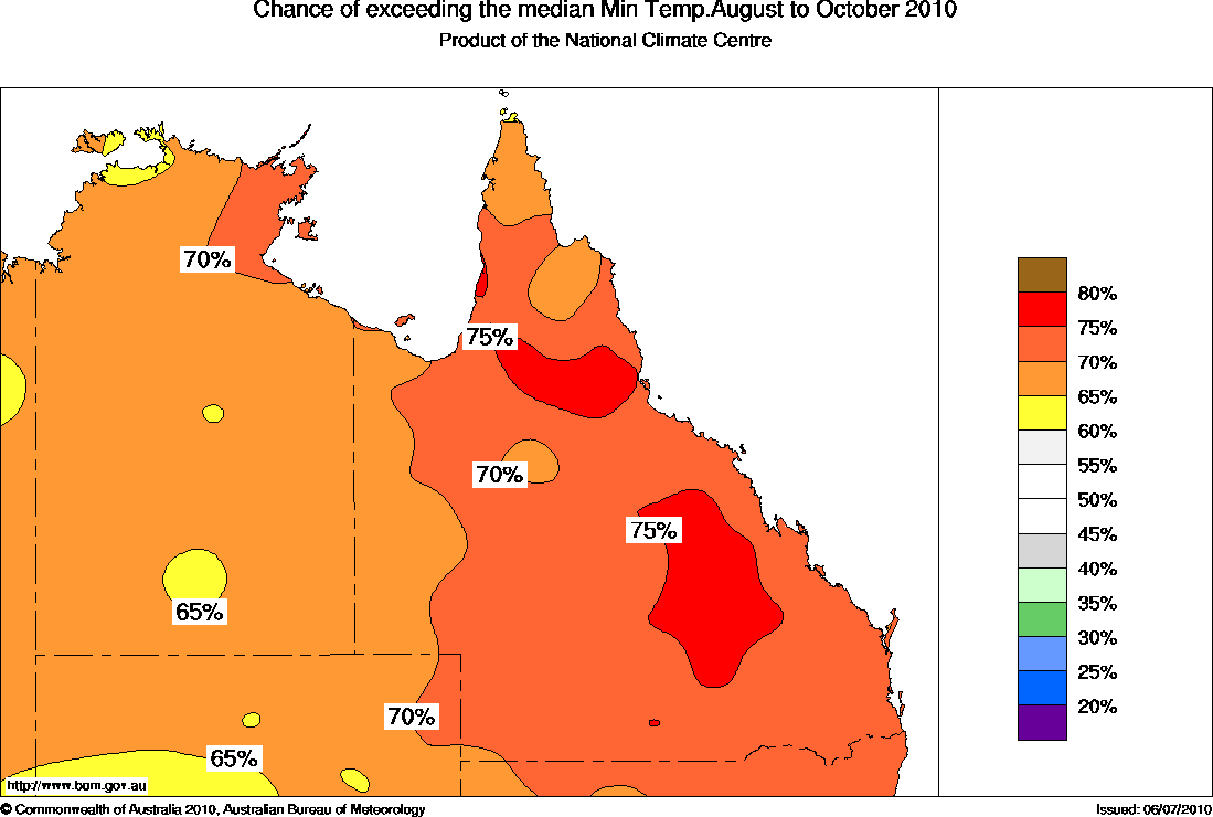 The chance that the average August-October minimum temperature will exceed the long-term median minimum temperature, is above 60% across all of northern Australia. Probabilities exceed 75% over parts of inland eastern Queensland.