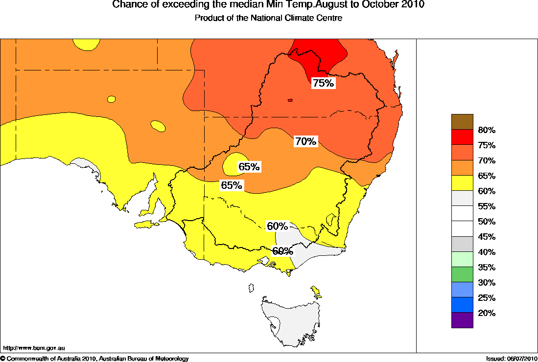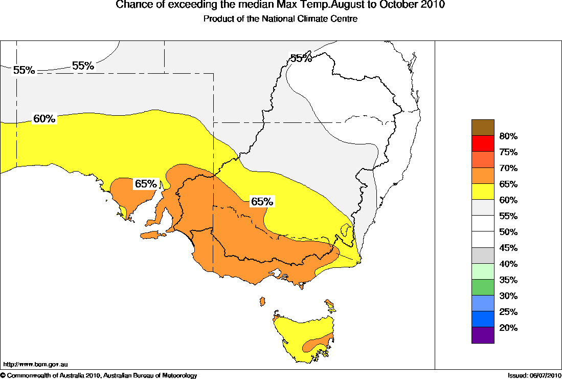 The outlook for temperatures for south-eastern Australia over late winter to mid-spring (August to October) favours warmer than normal minimum temperatures for most of south-eastern Australia. Maximum temperatures are favoured to be above average for the southern half of SA, southwestern NSW as well as all of Victoria and Tasmania.