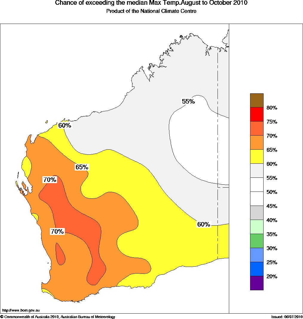 The Western Australian outlook for maximum temperatures over late winter to mid spring (August to October) favours warmer than normal days for the southwestern half of WA , while warmer nights are favoured for almost the whole of the state.