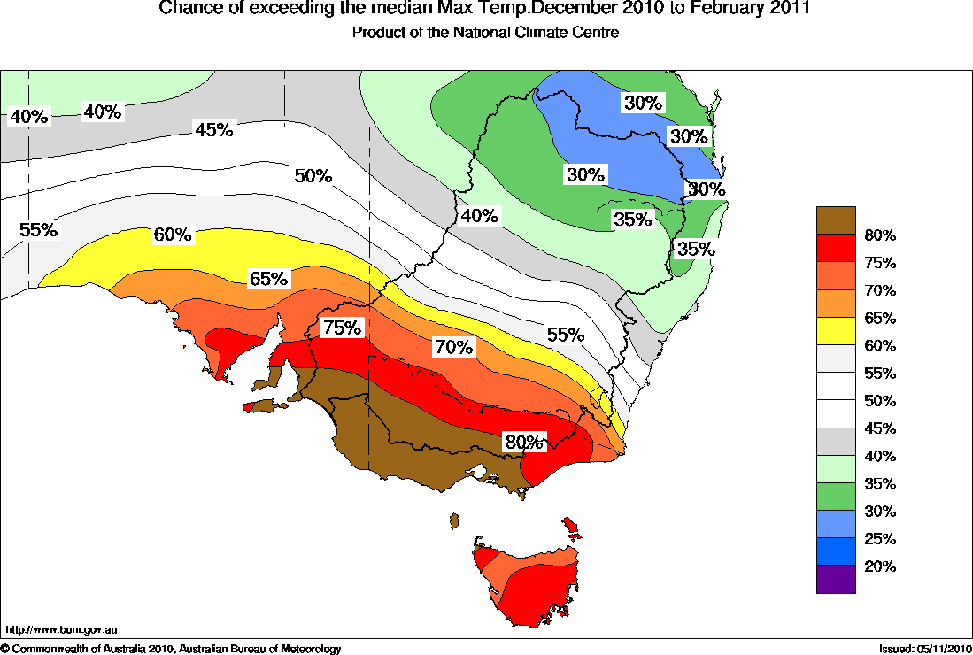 The chance that the daytime temperatures will be warmer than the long-term median maximum temperature for the December to February period is greater than 60% over southern New South Wales and in the south of the South Australian pastoral areas, with the odds strengthening to greater than 75% over all of Victoria and South Australian agricultural areas. This means that out of every ten years with ocean patterns like the current, six to eight years would be expected to be warmer than average for this summer.
