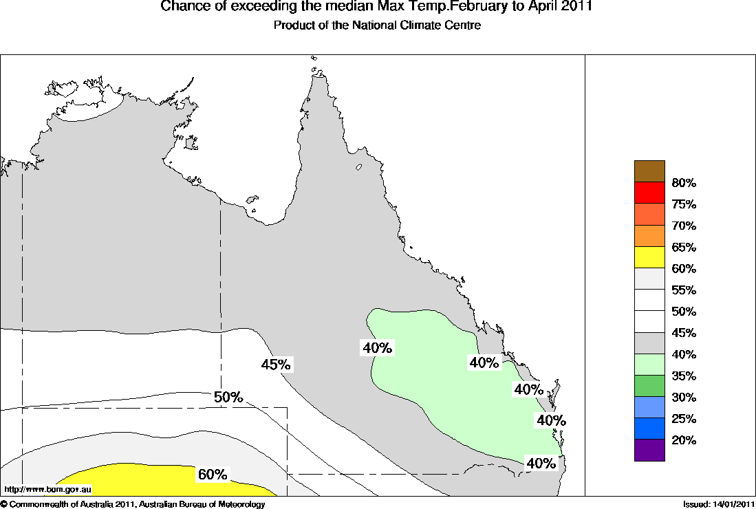 The chance that the average February to April maximum temperature will exceed the long-term median maximum temperature is between 35 and 40% across parts of southeastern Queensland (see map). This means that for every ten years with ocean patterns like the ones currently observed, about six or seven February to April periods would be expected to be cooler than average in these areas, with about three or four being warmer.