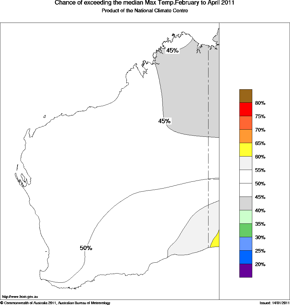 More information on this outlook is available from 8.30am to 4.30pm (WST) Monday to Friday by contacting the Climate Services Centre in the Bureau's Perth Office: (08) 9263 2222.
