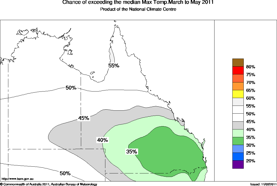 The chance that the average March to May maximum temperature will exceed the long-term median maximum temperature is between 30 and 40% across parts of southern Queensland (see map). This means that for every ten years with ocean patterns like the ones currently observed, about six or seven February to April periods would be expected to be cooler than average in these areas, with about three or four being warmer.