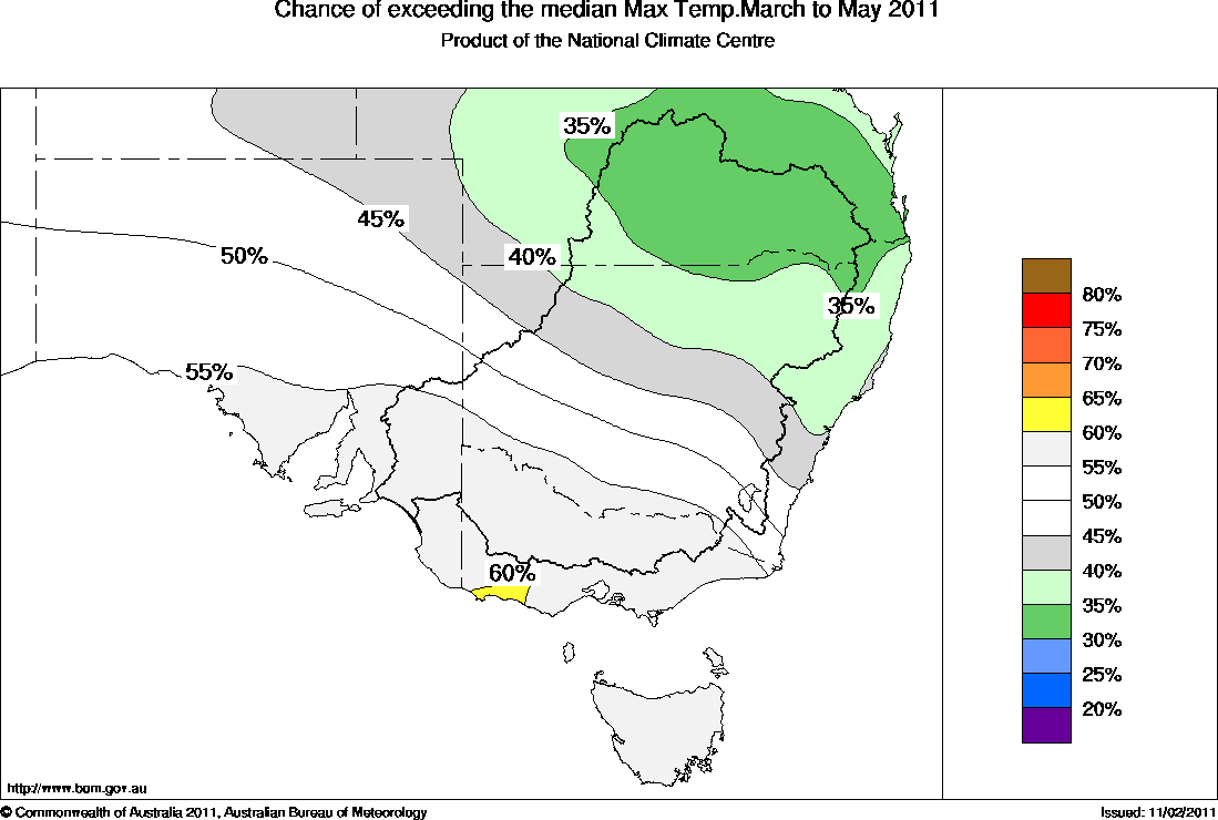 Southeastern Aust Seasonal Temperature Outlook: probabilities for Autumn 2011, issued 24th February 2011