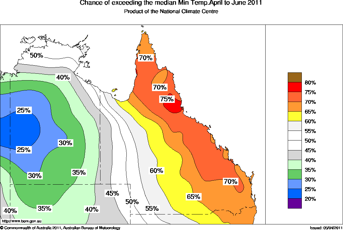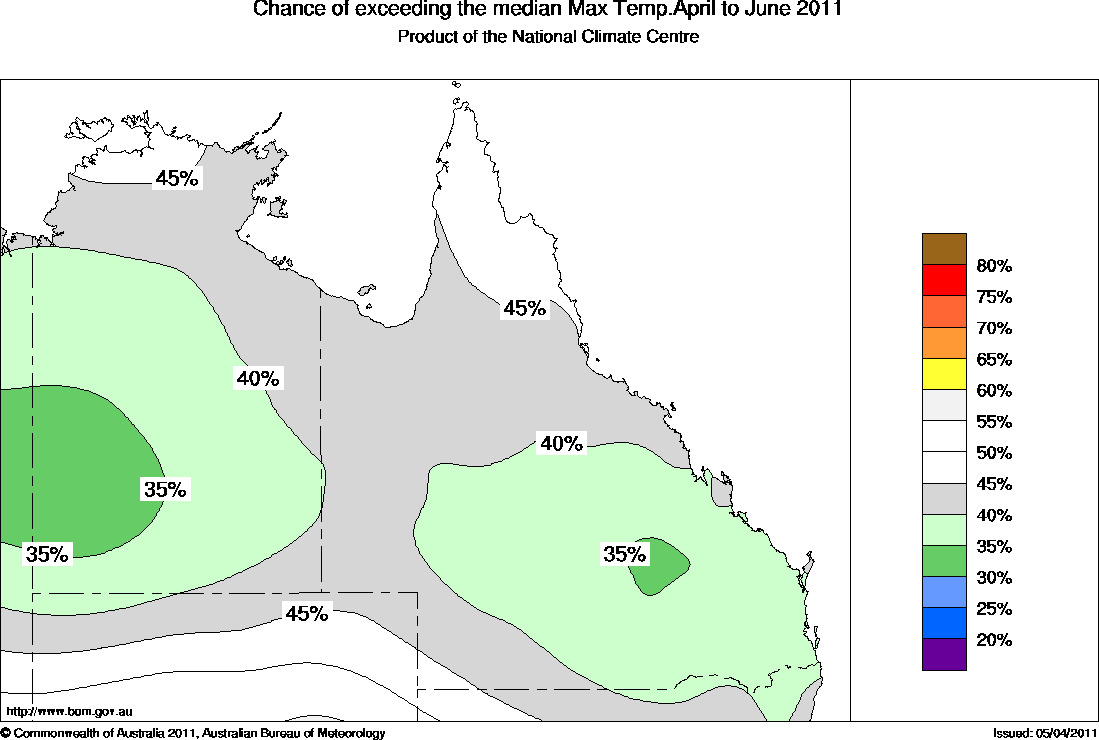 The north Australian outlook for maximum and minimum temperatures averaged over the April to June period favours cooler daytime and night-time temperatures for most of the Northern Territory. Cooler days are favoured for southeastern Queensland while warmer nights are favoured for eastern Queensland.