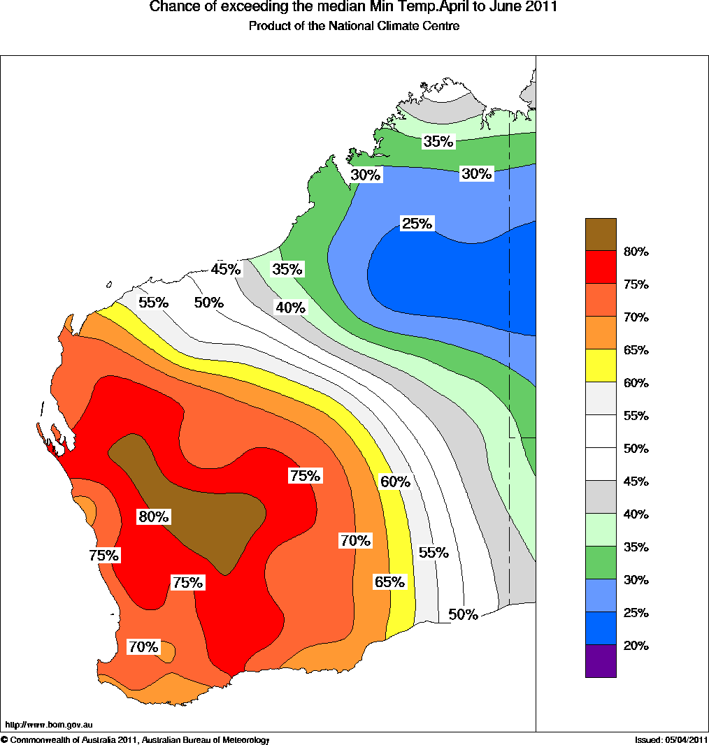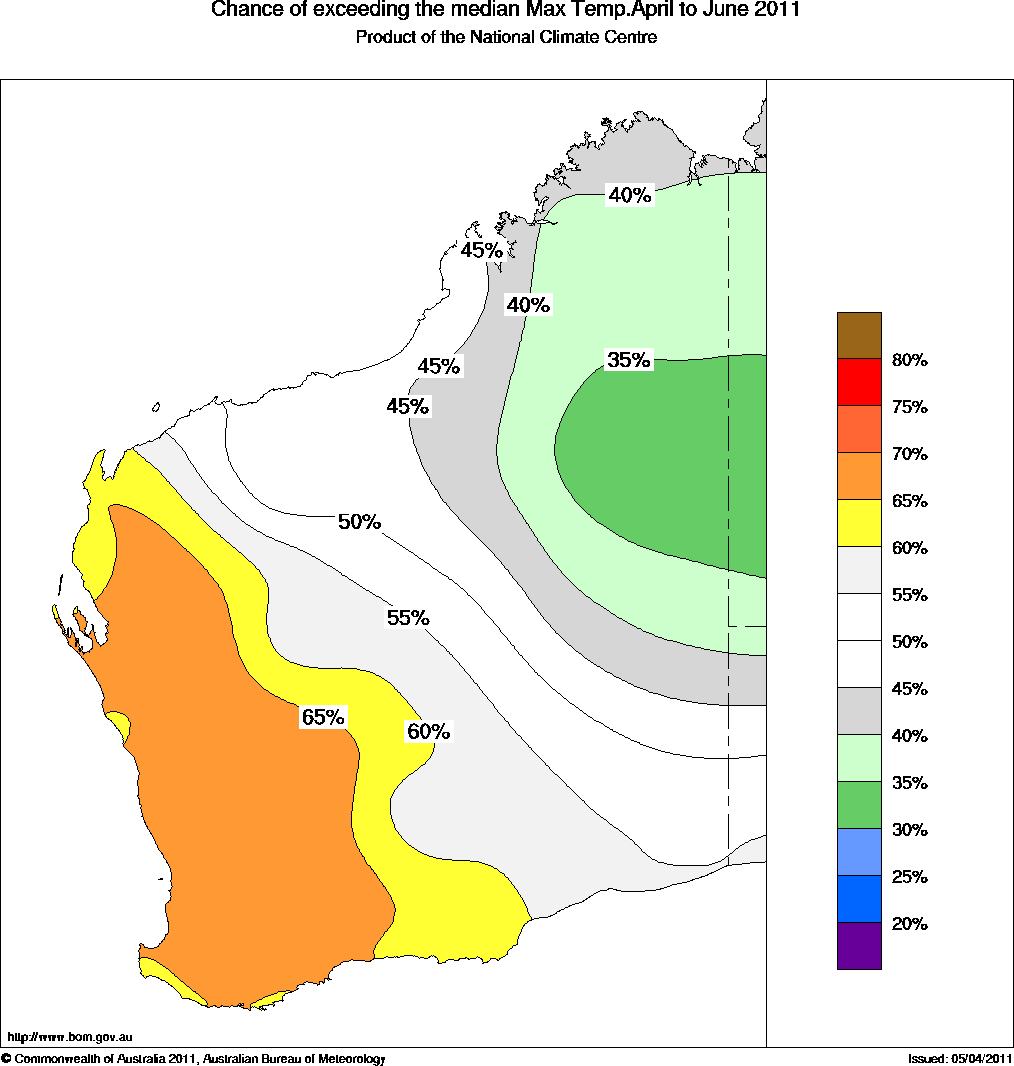 More information on this outlook is available from 8.30am to 4.30pm (WST) Monday to Friday by contacting the Climate Services Centre in the Bureau's Perth Office: (08) 9263 2222.