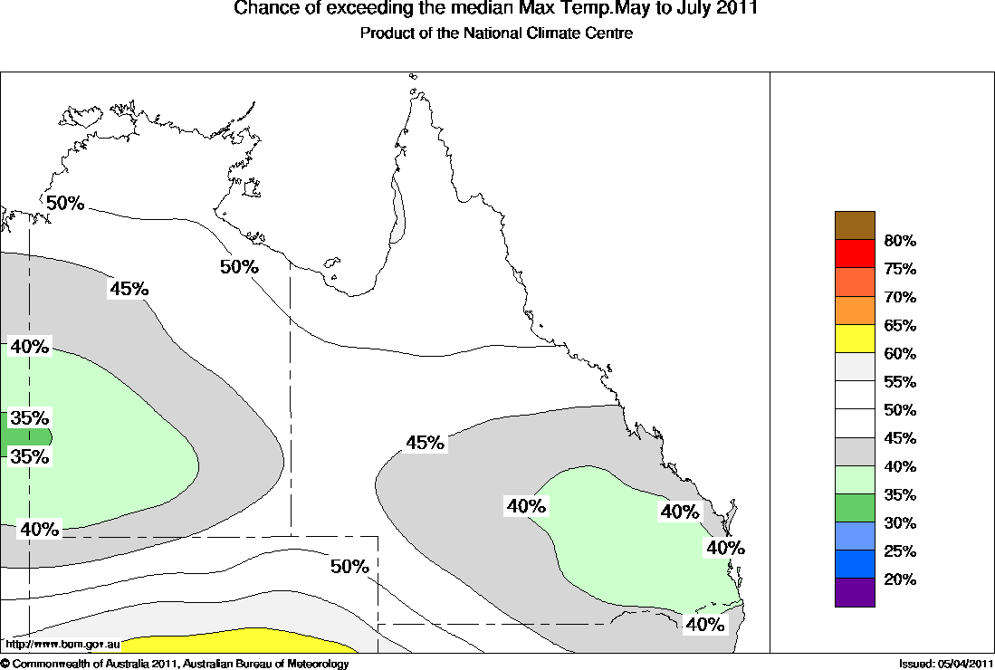 Northern Aust Seasonal Temperature Outlook: probabilities for May to July 2011, issued 19th April 2011