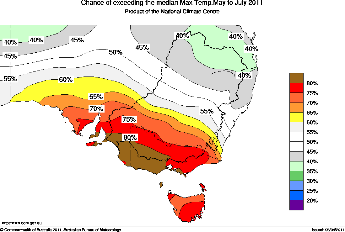 Southeastern Aust Seasonal Temperature Outlook: probabilities for May to July 2011, issued 19th April 2011