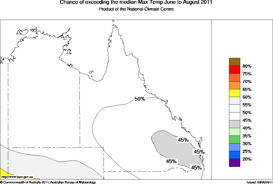 The chance that the average dry season (June to August) maximum temperature will exceed the long-term median maximum temperature ranges from 40% in southeast Queensland to 55% across northern Australia (see map). This means that cooler days are equally as likely as warmer days.