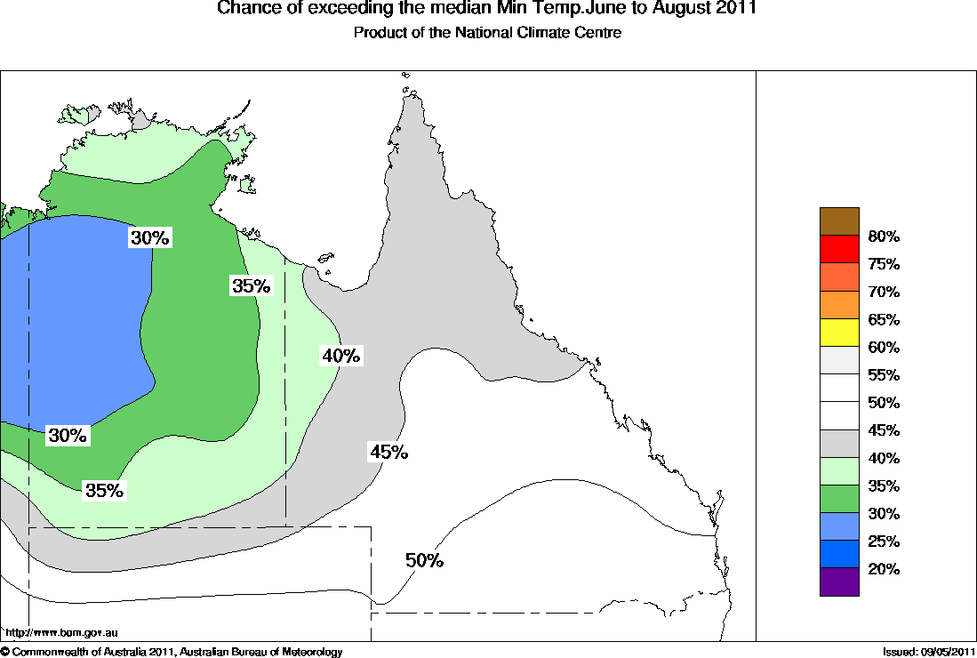 The average minimum temperature for the start of the dry season (June to August) is favoured to be below the long-term median minimum temperature across all of the Northern Territory and western parts of Queensland. In these areas the chances of warmer nights is less than 40%, with probabilities of below 30% in the Victoria River and Tanami regions of the Northern Territory. This means that for every ten years with ocean patterns like to the ones currently being observed, six to eight dry seasons would be expected to be cooler than average, with only two to four being warmer.