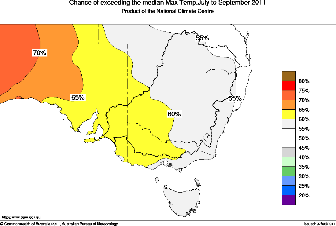 The chance that the average July to September maximum temperature will exceed the long-term median maximum temperature increases from about 60% in western NSW and western Victoria to about 70% in western South Australia (see map). This means that for every ten years with ocean patterns like the ones currently observed, about six to seven July to September periods would be expected to be warmer than average in these areas, with about three to four being cooler.