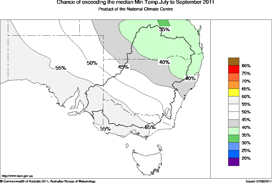 The likelihood that the average minimum temperature will exceed the long-term median minimum temperature for July to September is less than 40% in the far northeast of NSW. This means that for every ten years with ocean patterns like the ones currently observed, about four years are warmer than average, whilst six years are cooler than average in that area.