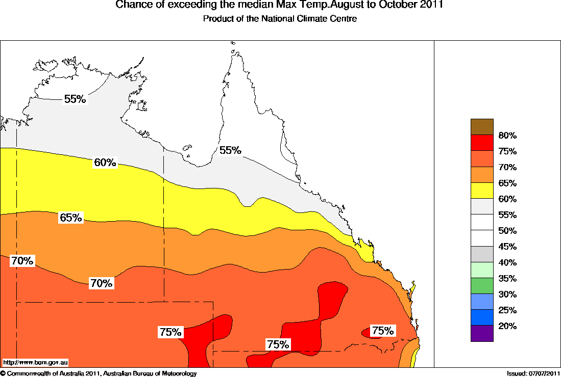 The chance that the average minimum temperature for August to October will exceed the long-term median minimum temperature is between 60 and 75% across the western half of Queensland and most of the NT (see map).