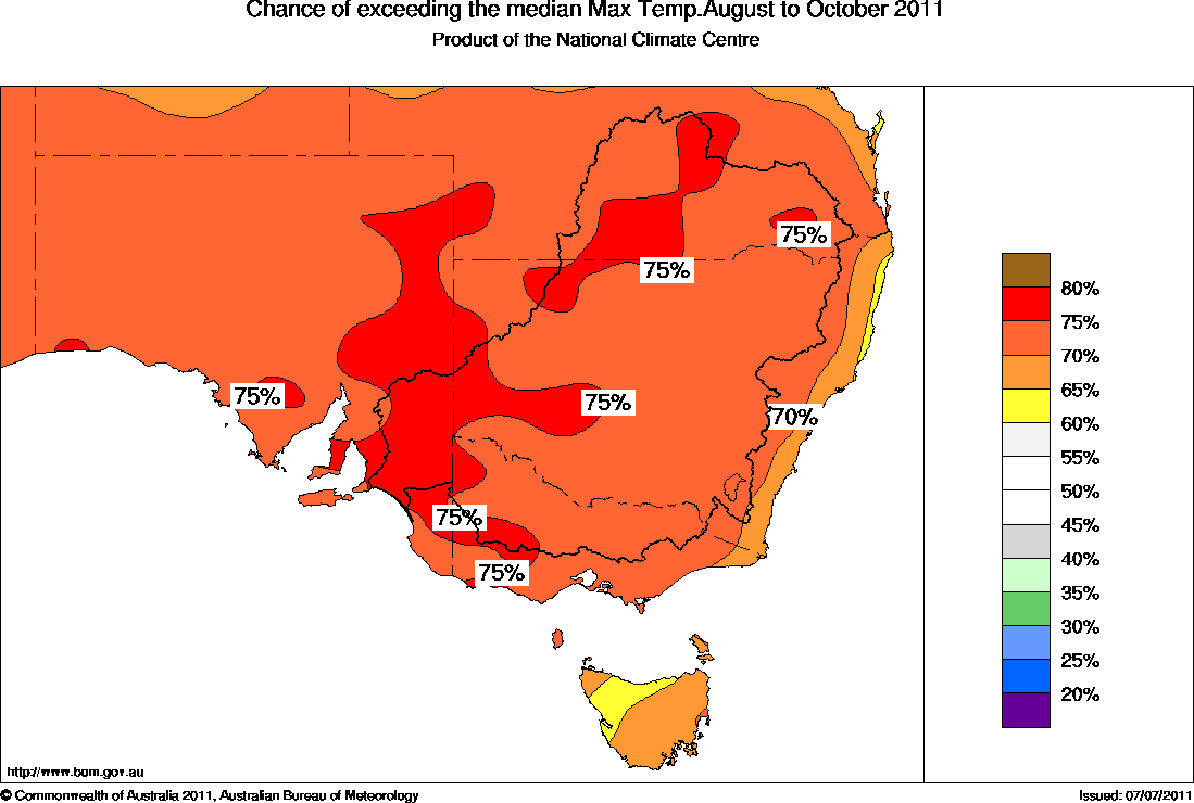 The southeastern Australian outlook for maximum and minimum temperatures averaged over late winter to spring (August to October) strongly favours warmer days throughout southeastern Australia. The outlook for minimum temperature favours warm nights, particularly over South Australia and western parts of Victoria and NSW.