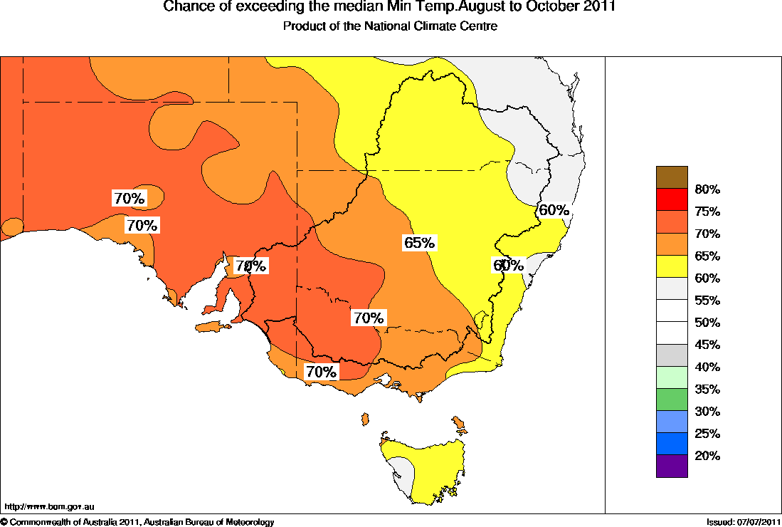 The likelihood that the average minimum temperature will exceed the long-term median minimum temperature for August to October is between 60 and 75% across most of southeastern Australia with probabilities rising above 70% across most of SA, western Victoria and southwestern NSW.