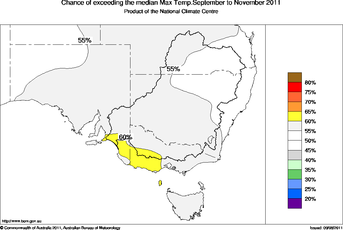 The chance that the average September to November maximum temperature will exceed the long-term median maximum temperature is between 60 and 65% in a small region covering southeastern SA and western Victoria (see map). This means that for every ten years with ocean patterns like the ones currently observed, about six September to November periods would be expected to be warmer than average in these areas, with about four being cooler.