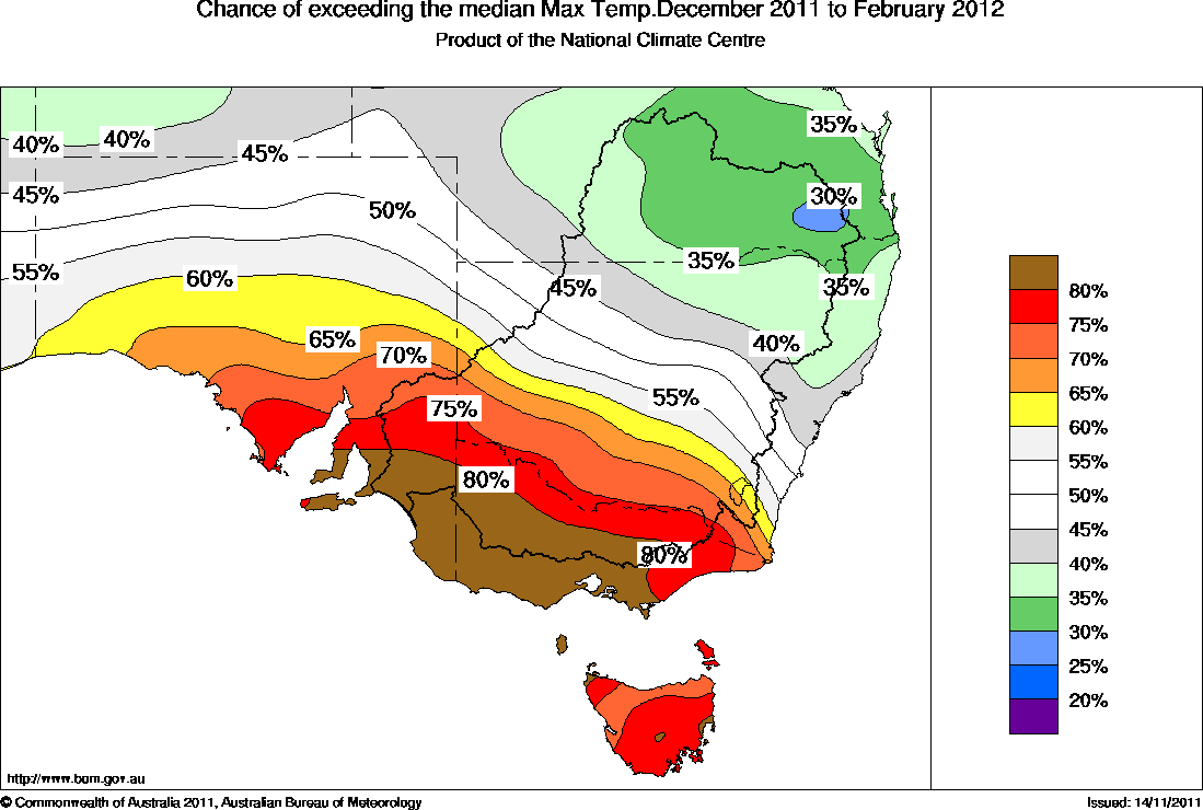 The southeast Australian temperature outlook averaged over December 2011 to February 2012 shows the following: