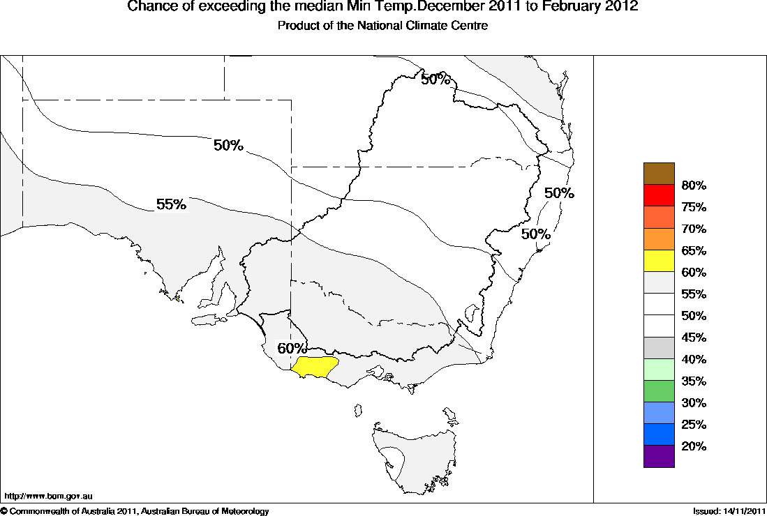 There is no strong shift in the odds towards warmer or cooler minimum temperatures across southeastern Australia during summer (see map). In other words, the chance that the average summer minimum temperature will exceed the long-term median minimum temperature is roughly 50%.