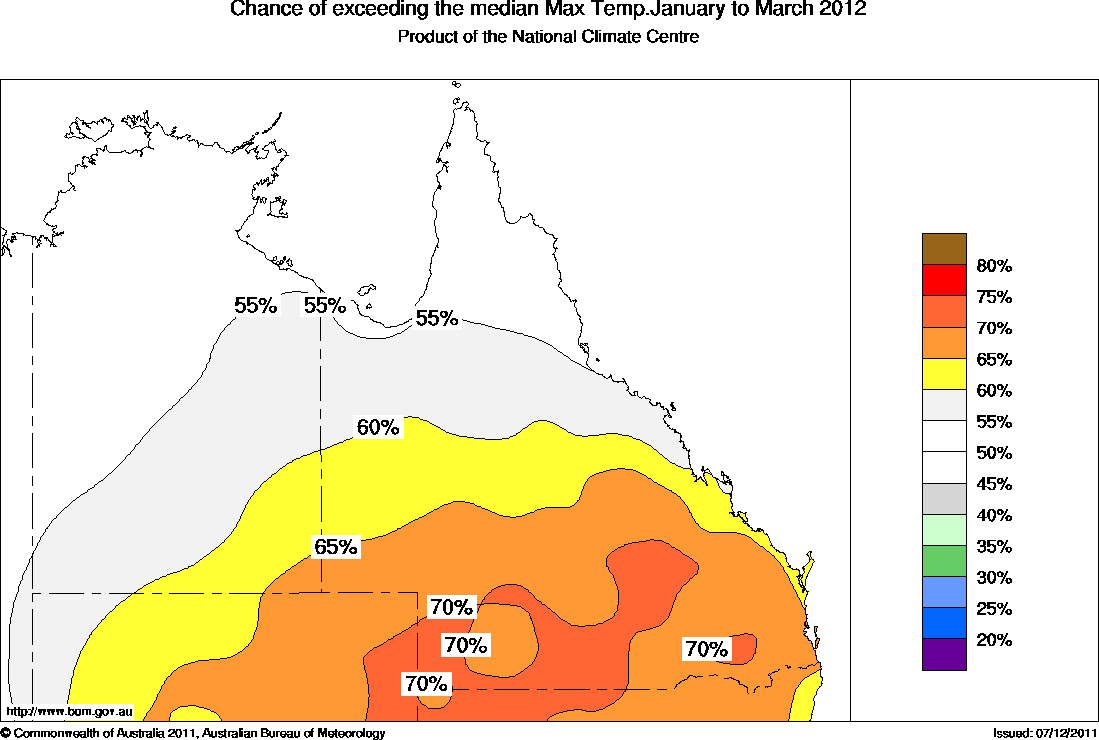The north Australian temperature outlook averaged over January to March 2012 shows the following: