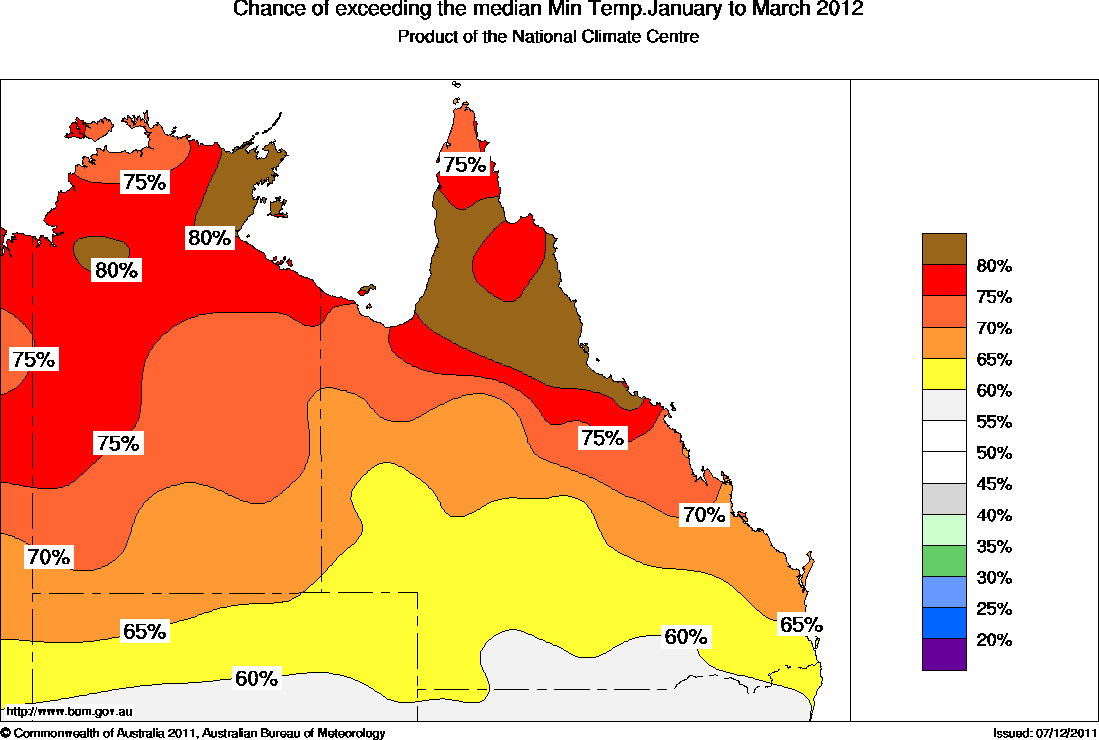 The chance that the average minimum temperature for January to March will exceed the long-term median minimum temperature is above 60% across northern Australia. Probabilities exceed 80% across northern Queensland the the eastern Top End of the NT (see map).