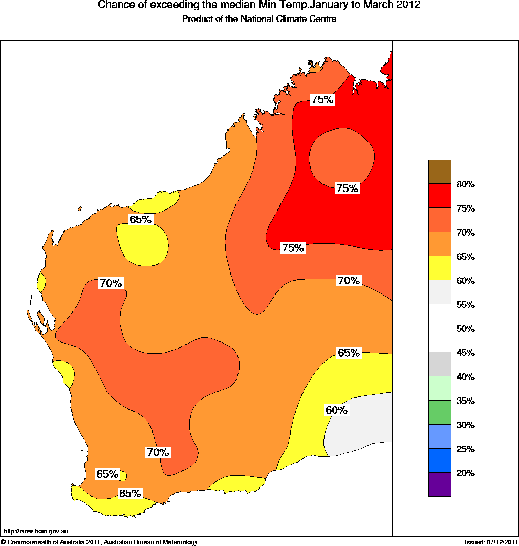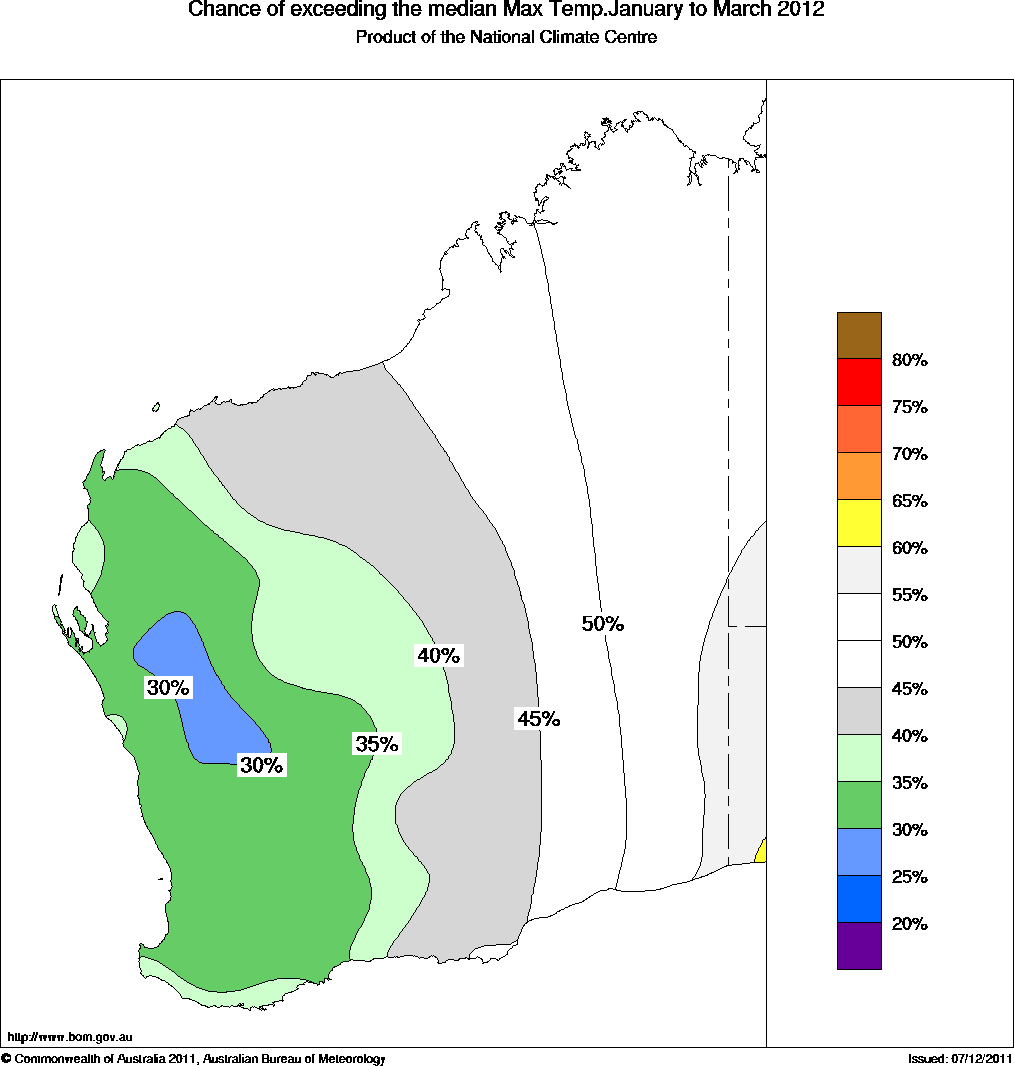 The Western Australian temperature outlook for January to March 2012 shows the following: