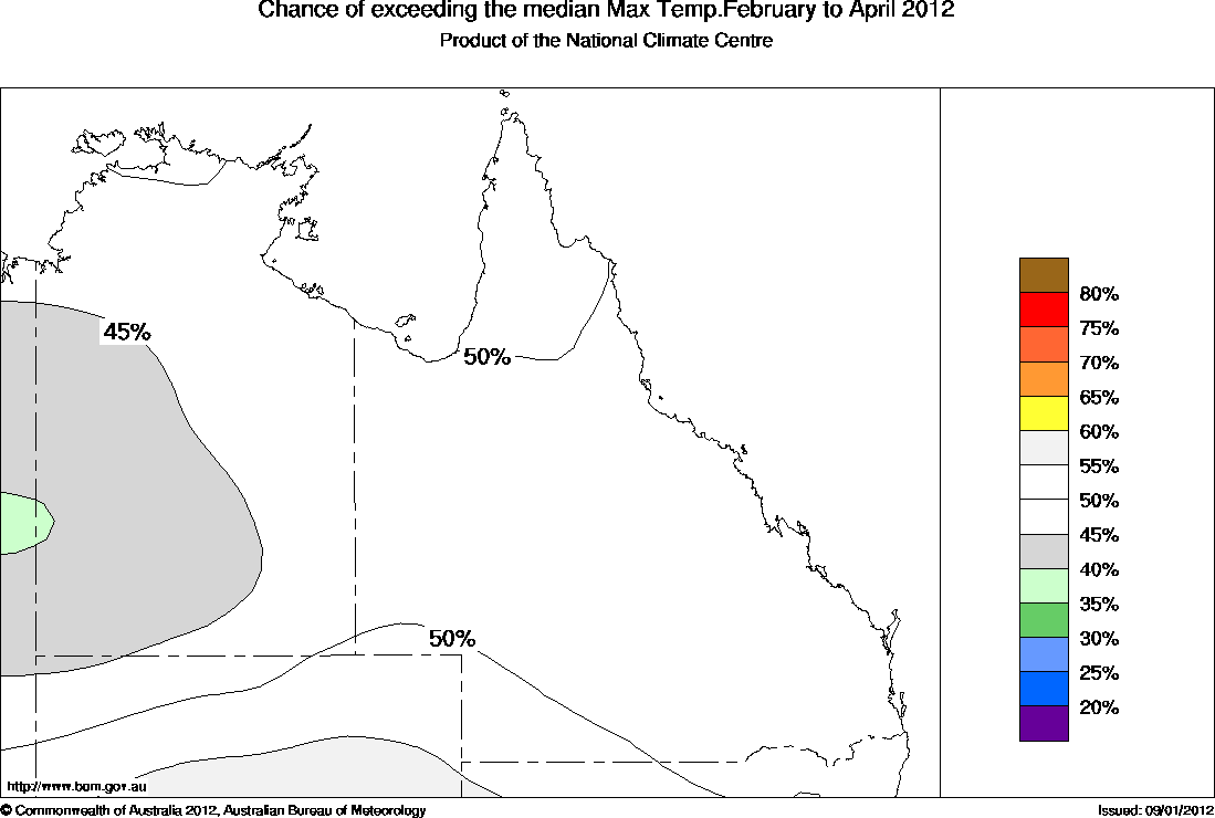 The northern Australian temperature outlook averaged over February to April 2012 shows the following: