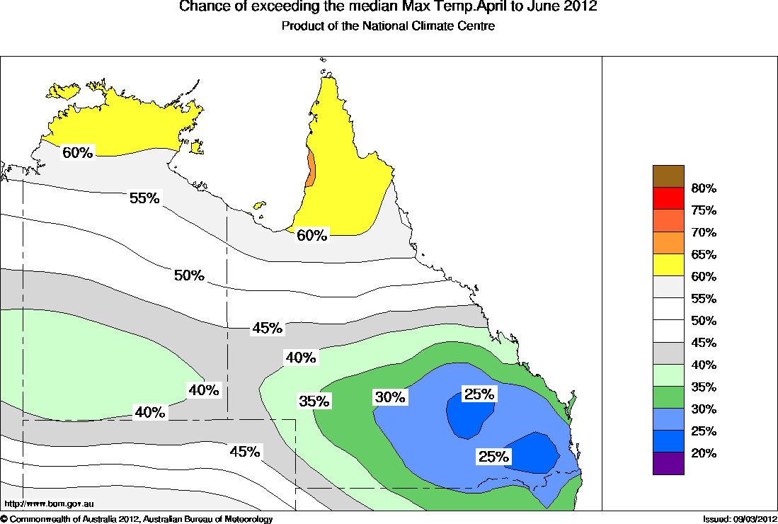 The northern Australian temperature outlook averaged over April to June 2012 shows the following: