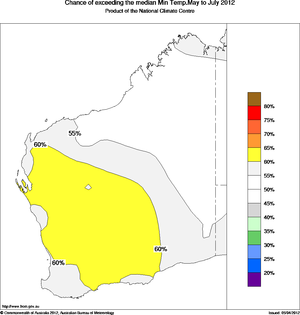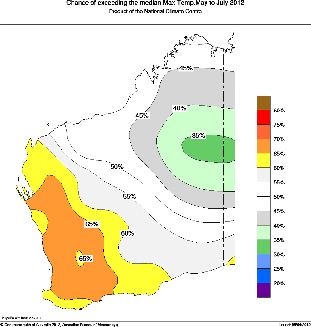 WA Seasonal Temperature Outlook: probabilities for May to July 2012, issued 24th April 2012