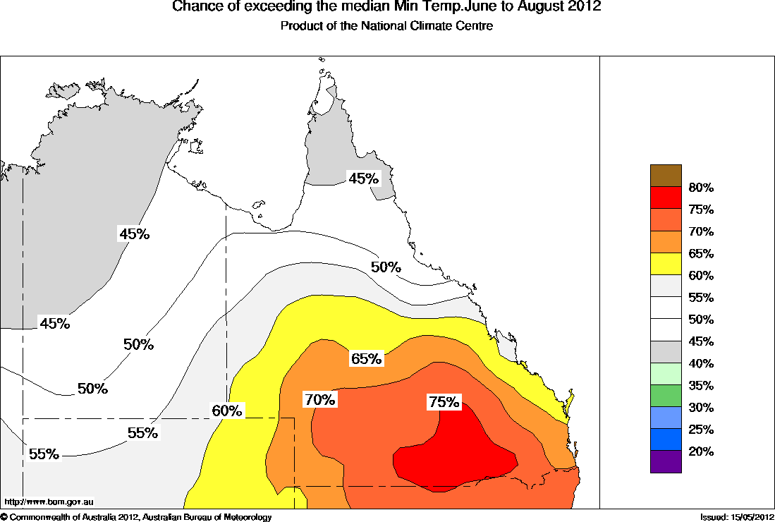 There is a greater than 60% chance that the average minimum temperature will exceed the the long-term median minimum temperature across the southern half of Queensland, with these odds increasing to over 75% in the southern interior.