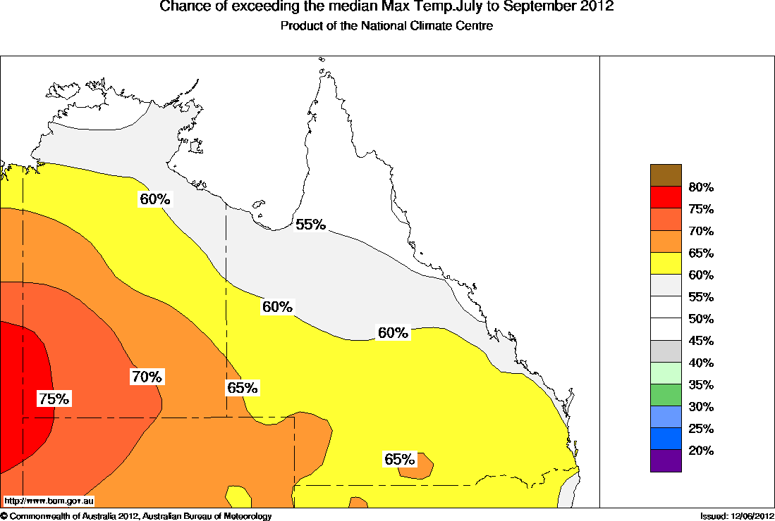 The chances that the average maximum temperature for the July to September period will exceed the long-term median maximum temperature are above 60% across the southern half of Queensland and the southern two-thirds of the NT (see map above).