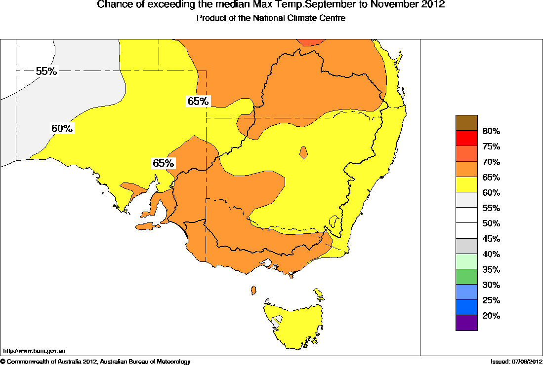 The southeast Australian temperature outlook for September to November 2012 shows: