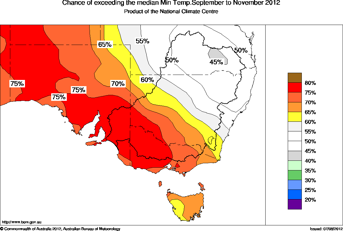 The chance that the average minimum temperature for spring will exceed the long-term median minimum temperature is greater than 60% across SA, Victoria, Tasmania and southwest NSW, with odds greater than 75% across western Victoria and much of southern and western SA. In northeast NSW, the odds of warmer or cooler nights during spring are roughly equal.