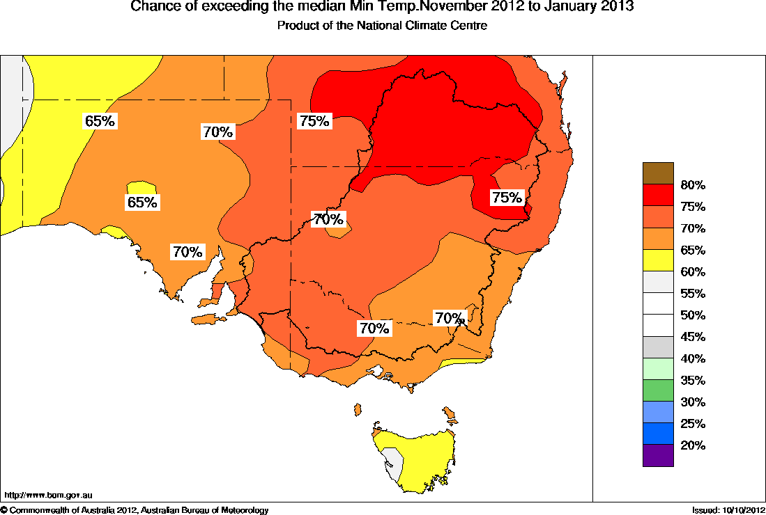 The chances that the average minimum temperature for November to January will exceed the long-term median minimum temperature are above 60% over most of southeast Australia. Probabilities exceed 75% over parts of northern NSW (see map above).