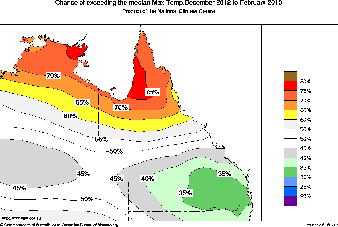 The chances that the average December to February maximum temperature will exceed the long-term median maximum temperature are between 60 and 80% over far northern Australia (see map above). Such odds mean that for every ten years with similar ocean patterns to those currently observed, about six to eight December to February periods would be expected to be warmer than average in the far north, while about two to four years would be cooler for this time of year.