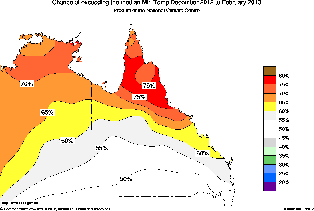 The chances that the average minimum temperature for December to February will exceed the long-term median minimum temperature are between 60 and 80% over most of the NT and northern parts of Queensland (see map above).