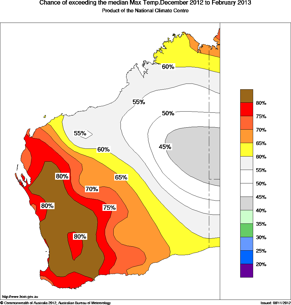 More information on this outlook is available from 8.30am to 4.30pm (WST) Monday to Friday by contacting the Climate Services Centre in the Bureau's Perth Office: (08) 9263 2222.