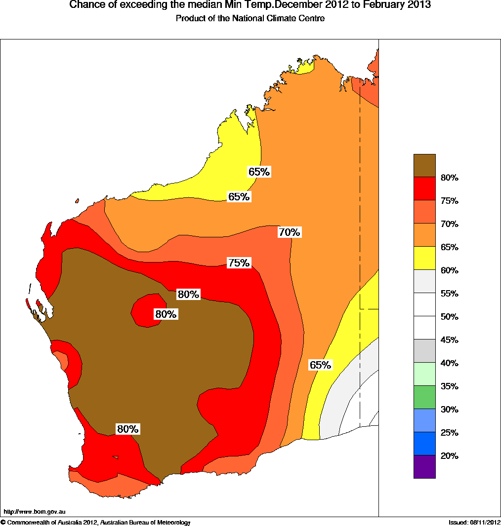 The chances that the average minimum temperature for summer will exceed the long-term median minimum temperature are above 60% across most of WA, with probabilities exceeding 80% over parts of western, central and southern WA (see map above).