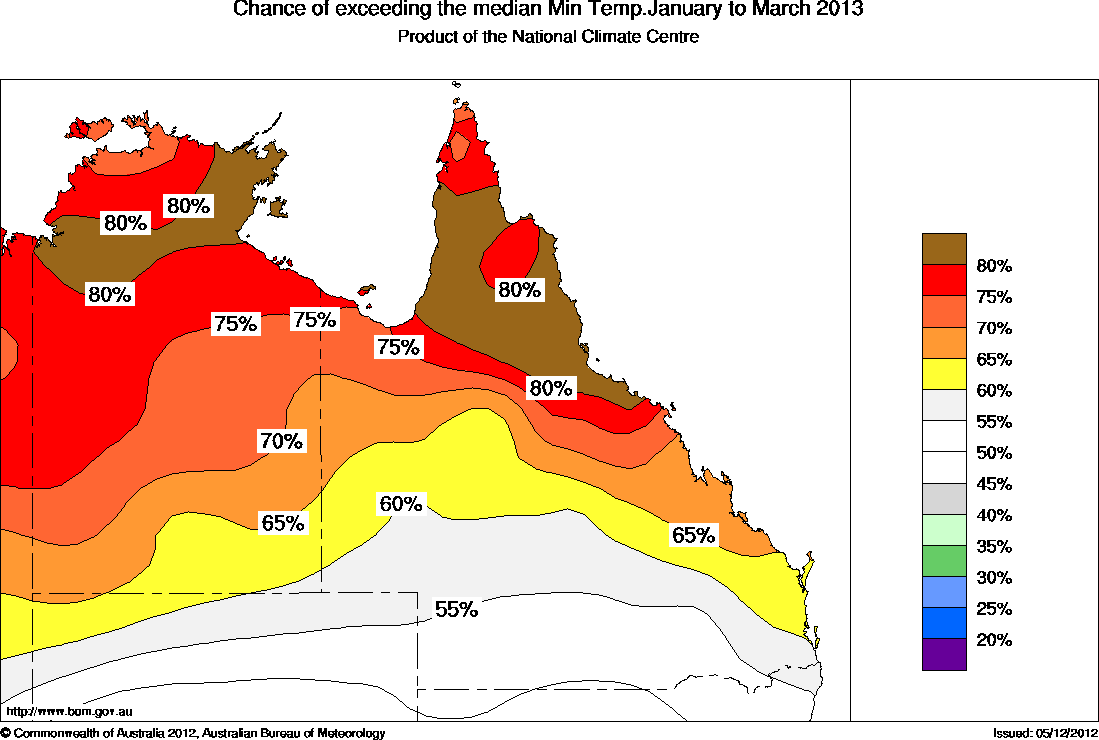 The chances that the average minimum temperature for January to March will exceed the long-term median minimum temperature are above 60% over the Northern Territory and the northern half of Queensland. In contrast, the chances of warmer or cooler nights are roughly equal in southern Queensland (see map above).