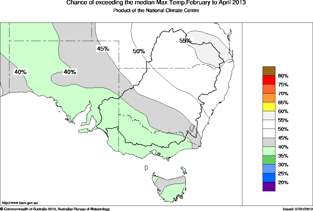 The chances that the February to April maximum temperature will exceed the long-term median maximum temperature is between 35 and 40% over a large region across northwest and southern SA, Victoria, southwest NSW and parts of Tasmania (see map above). Such odds mean that for every ten years with similar oceans patterns to those currently observed, about four February to April periods would be expected to be warmer than average over these areas, while about six years would be cooler.