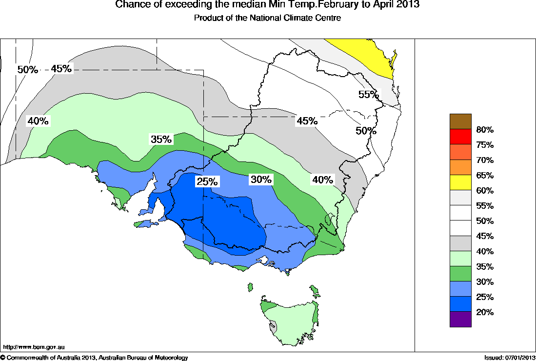 The chance that the average minimum temperature for February to April will exceed the long-term median minimum temperature is between 20 and 40% over most of southeastern Australia (see map above). Odds drop to between 20 and 25% across southeast SA, western Victoria and southwest NSW.