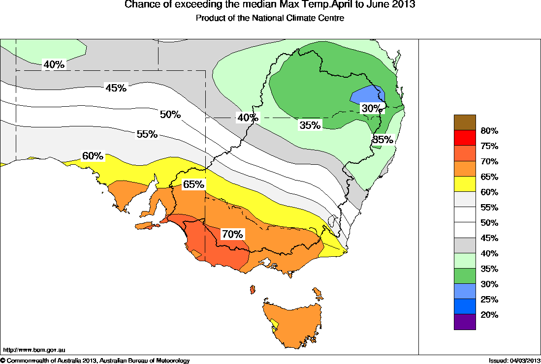 Southeastern Aust Seasonal Temperature Outlook: probabilities for April to June 2013, issued 20th March 2013