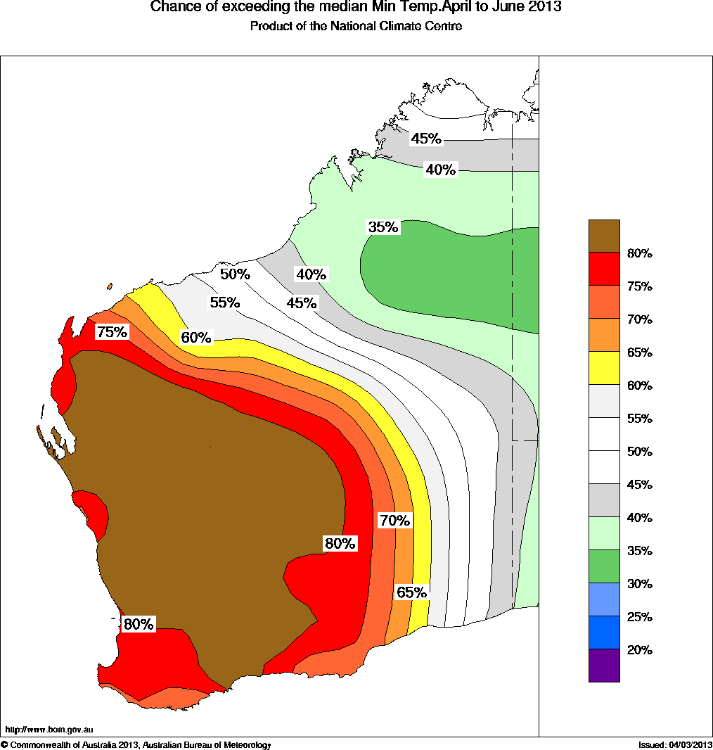 WA Seasonal Temperature Outlook: probabilities for April to June 2013, issued 20th March 2013